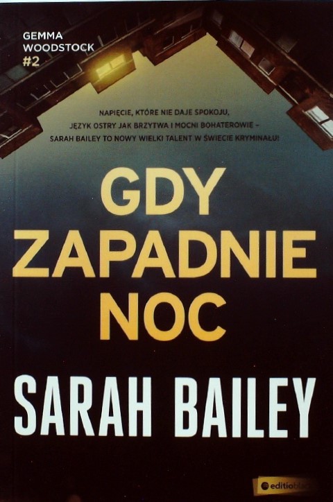 Detektyw Gemma Woodstock znów prowadzi śledztwo, tym razem w dużym mieście, do którego niedawno się przeprowadziła. Samotna i zagubiona, cierpi z powodu ważnych życiowych decyzji, które musiała podjąć. Jej nowe miejsce pracy to prawdziwe pole minowe, a partner, którego jej przydzielono, jest wyjątkowo skryty i często okazuje jej wrogość. Kiedy zamordowany zostaje bezdomny mężczyzna, detektyw Woodstock zauważa, że czuje dziwną więź z ofiarą, która wiodła samotne życie w izolacji, mimo że mieszkała w centrum tętniącego życiem miasta. Wkrótce na planie zdjęciowym filmu ginie znany aktor. Gemma i jej partner muszą odłożyć na bok wszelkie urazy, by wspólnie odkrywać kolejne tajemnice życia i śmierci zamordowanego. Kto mógł popełnić tę zuchwałą zbrodnię i kto na niej skorzystał? Gemma szybko odkrywa, że takich osób jest wiele, a żadnej z nich nie można naprawdę ufać. Ale dopiero gdy orientuje się, że nawet najbliżsi mają sekrety i nie można im wierzyć, jej świat zaczyna się rozpadać... Wciągająca i imponująca kontynuacja Mrocznego jeziora. Sarah Bailey z wykształcenia jest dziennikarką. Kieruje firmą kreatywną Mr Smith, wcześniej zawodowo zajmowała się reklamą. W ciągu ostatnich kilku lat napisała wiele krótkich opowiadań i recenzji. Mroczne jezioro jest jej pierwszą powieścią, która szybko została okrzyknięta bestsellerem w Australii, USA i Kanadzie, a także wyróżniona kilkoma nagrodami. Obecnie Bailey mieszka w Melbourne w Australii. Ma dwóch synów i jednego wiekowego kota.