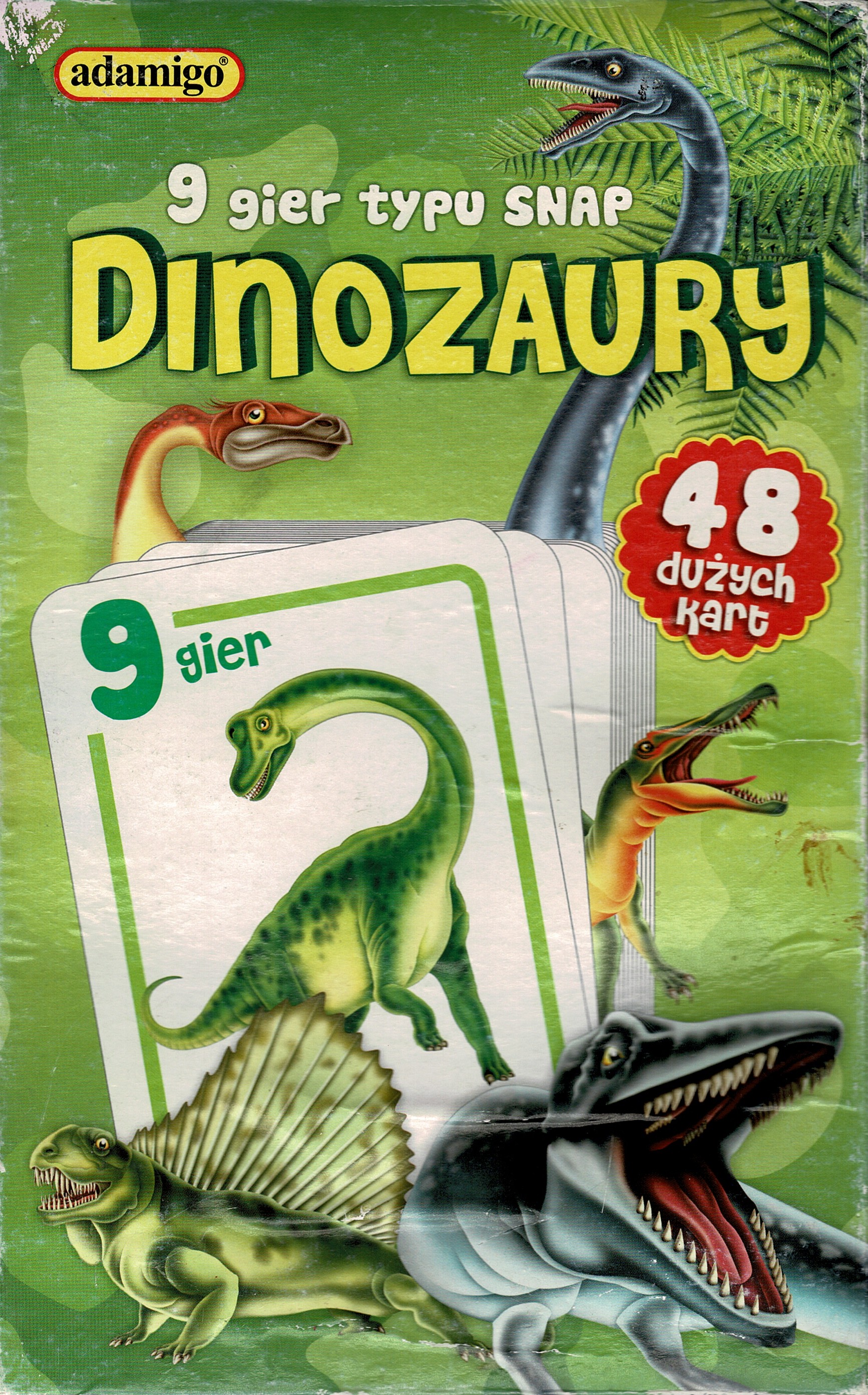 Dinozaury : 9 gier typu SNAP / ilustracje: Wojciech Szwalski. - Częstochowa : Adamigo, copyright 2012. - 1 gra (48 kart o wym. 11 cm x 7,4 cm, instrukcja z opisem dziewięciu gier rodzinnych) ; w pudełku 24x45x4 cm.