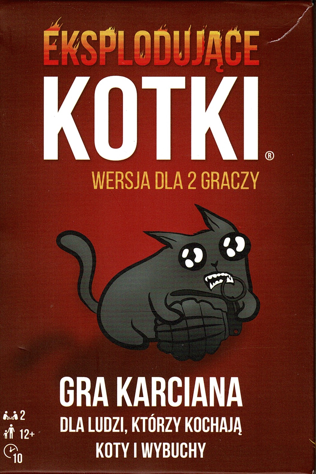 Spróbuj swoich sił w tej wysoce strategicznej, w pełni bezpiecznej wersji rosyjskiej ruletki! Podczas rozgrywek gracze co turę dobierają po jednej karcie, aż do momentu, gdy któryś trafi na puchatą bombę. Ów nieszczęśnik rozlatuje się na tysiąc kawałeczków i wypada z gry. Pozostałe karty służą do unikania eksplodujących kotków lub łagodzenia ich wybuchowego temperamentu. Eksplodujące Kotki: Wersja dla 2 graczy to specjalna odsłona popularnej serii, w pełni przystosowana do potrzeb wybuchowych par i duetów. Jeśli uwielbiacie negatywną interakcję i rozgrywki pełne emocji, właśnie znaleźliście karciankę idealną.