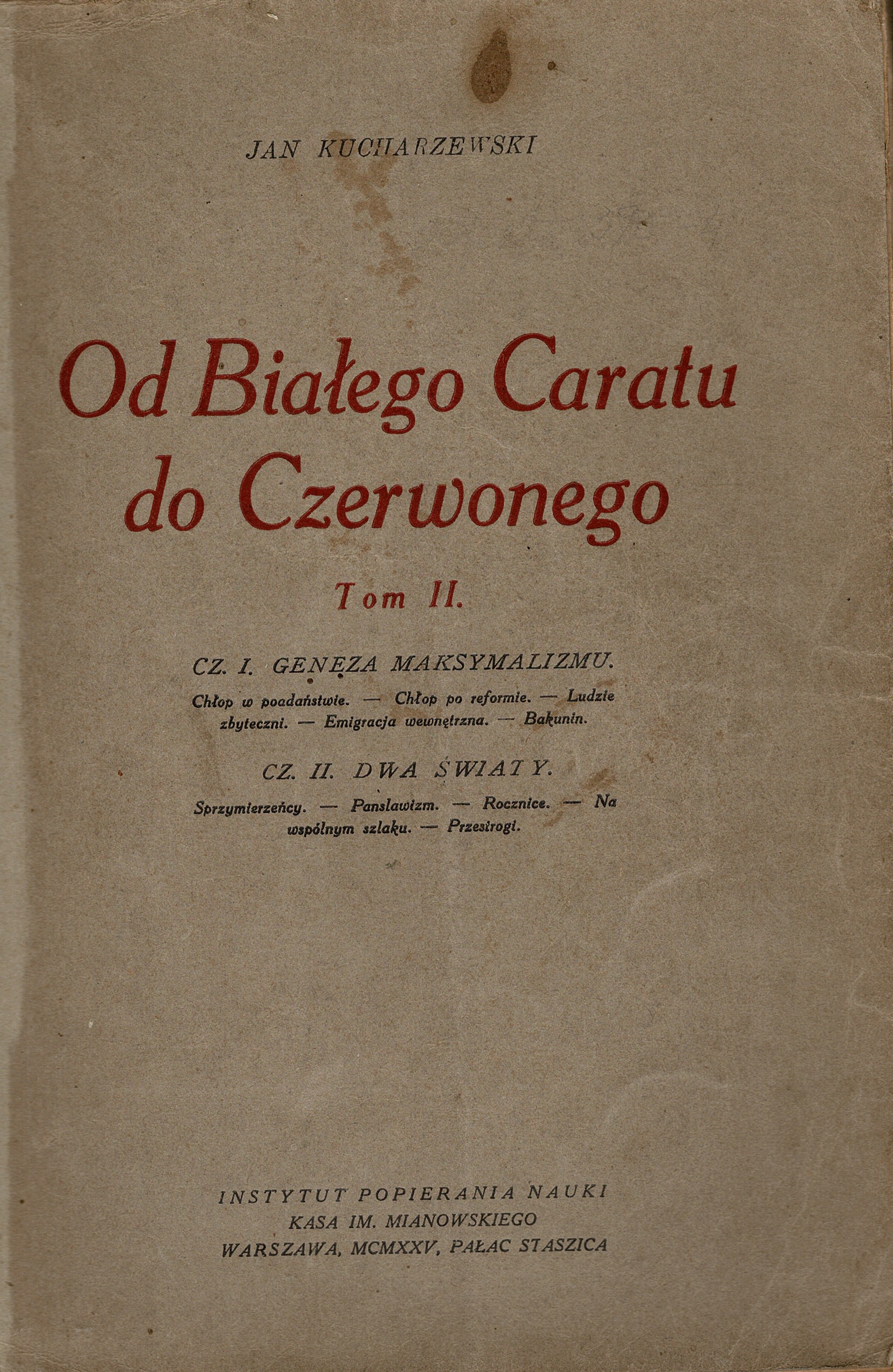 Dar Magdaleny Kwileckiej. Siedmiotomowe, nieukończone dzieło Jana Kucharzewskiego (1876-1952) "Od białego caratu do czerwonego" należy określić jako opus vitae tego wybitnego historyka, publicysty i polityka. Jest to gruntowne studium dziejów wewnętrznych Rosji w XIX stuleciu. Autor koncentruje uwagę na historii ruchu rewolucyjnego i polityki rosyjskiej wobec ziem polskich, ale najbardziej fascynuje go specyfika rosyjskiej myśli i kultury. Kucharzewski dowodzi tezy o jej zasadniczej odmienności od tradycji europejskiej, o przybierającym coraz to nowe kształty rosyjskim imperializmie i nacjonalizmie oraz o wynikających stąd zagrożeniach. Ogromna wiedza i erudycja autora oraz wykorzystanie niezwykle bogatych materiałów źródłowych sprawiają, że mimo postępu badań nad dziejami Rosji nawet i dziś nie jest to tylko pozycja należąca do historii historiografii. Napisany z literackim zacięciem cykl książek, z których każda może stanowić osobną całość, ma wszelkie walory naukowego eseju. Pierwsze wydanie ukazało się w latach 1923-1935 w stosunkowo niewysokim nakładzie i w czasach PRL należało do książek najsurowiej zakazanych, dostępnych wyłącznie w największych bibliotekach naukowych po uzyskaniu specjalnego zezwolenia.