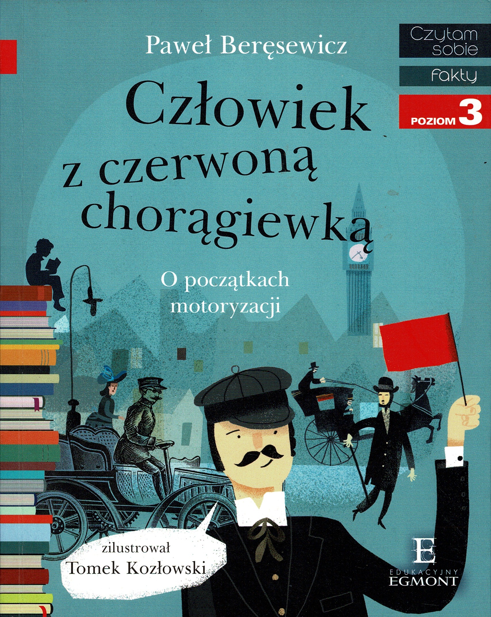 "Człowiek z czerwoną chorągiewką" to opowieść o początkach motoryzacji i pierwszych samochodach. Bohaterem jest kilkuletni chłopiec, którego tata pracuje jako człowiek z czerwoną chorągiewką - we wczesnych latach motoryzacji ktoś taki musiał zawsze biec przed pojazdem i ostrzegać przechodniów.