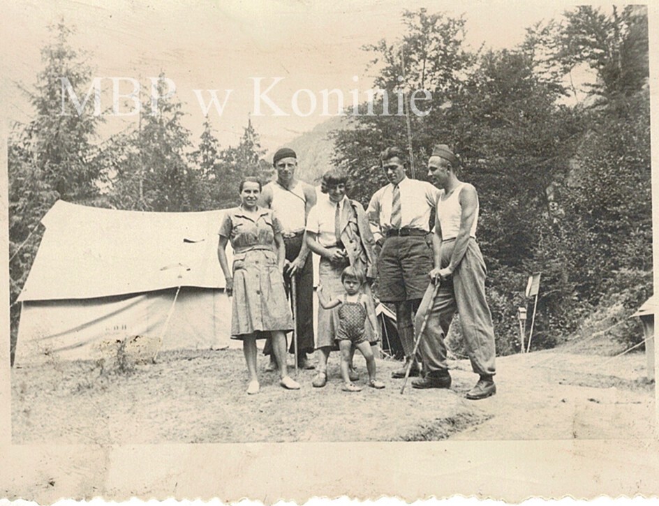 [Grupa turystów z dzieckiem w górach na biwaku] / J. Sypniewski Foto-Film. - [między 1932-1939]. - 1 fotografia ; 6,2x8,5 cm.